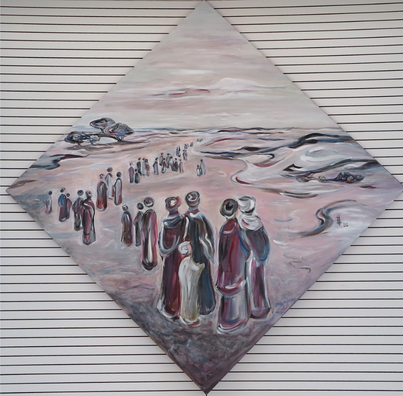 01-2025-01 «Pilgerweg zu Gott», 120x120, Acryl auf Leinwand, mit aufgenähten Steinen. Das Foto zeigt das Bild an der Wand in der Rotonda.